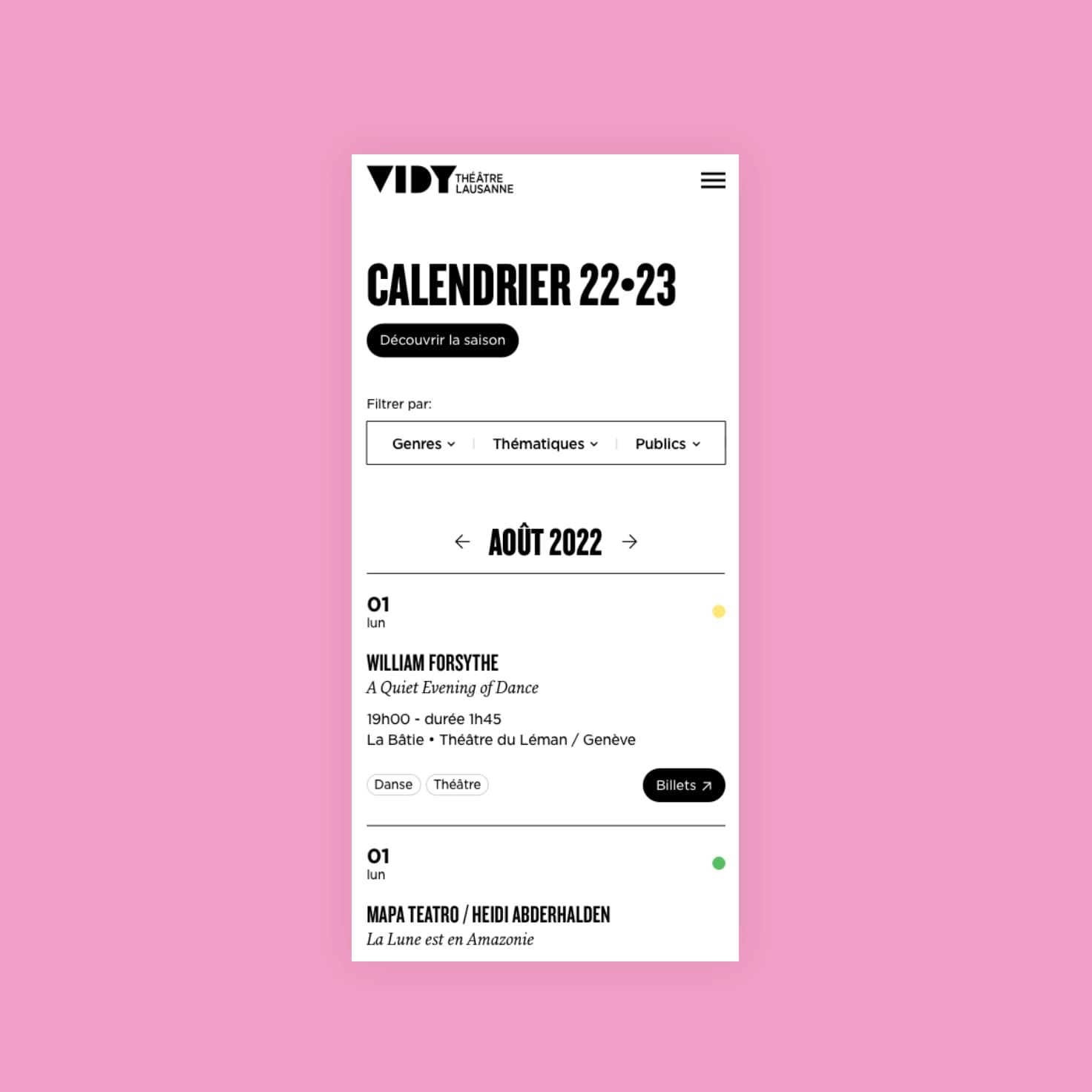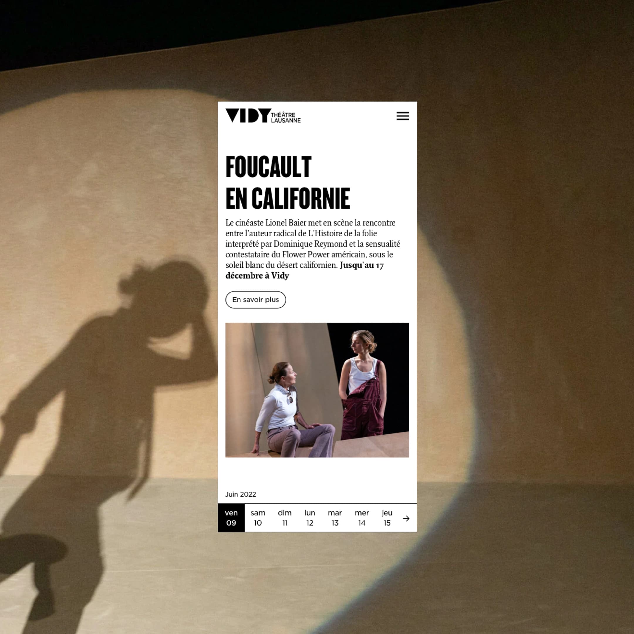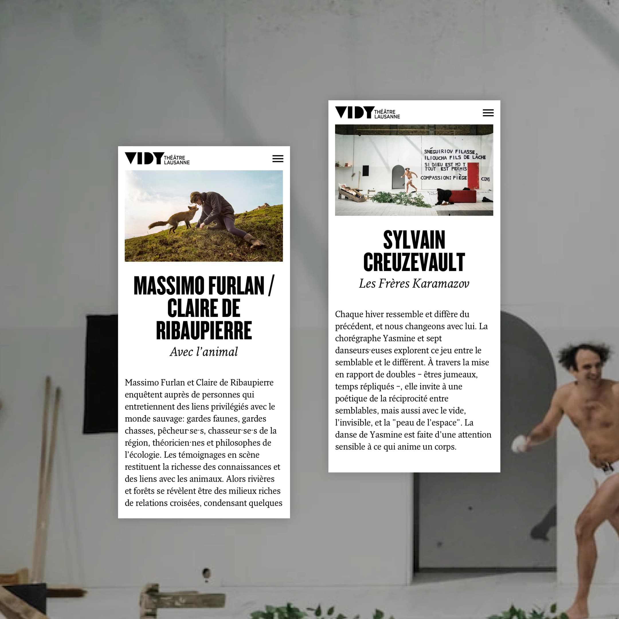 À la suite du travail d’architecture de l’information que le théâtre a mandaté, nous avons collaboré de manière intensive avec l’équipe de Vidy pour concevoir et créer un design communiquant l'esprit créatif, fait de ruptures, de contrastes, de superpositions et de jeu avec l'espace.